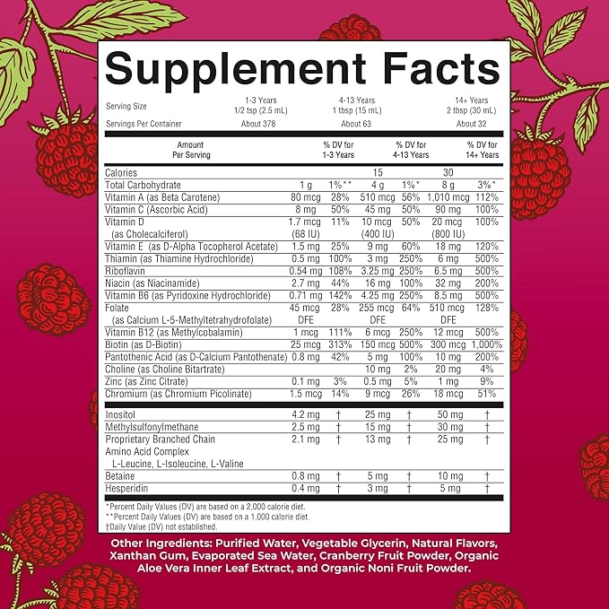 For Most Lifestyles: MaryRuth’s Raspberry Liquid Morning Multivitamins for Women, Men, Kids is Non-GMO, Vegan, Dairy Free, Nut Free, Gluten Free, Sugar Free. Each bottle comes with 30-32 servings. Multivitamin for women 50 and over, under 50, men 50 and over, under 50, and kids ages 2+. B Corp Certified.